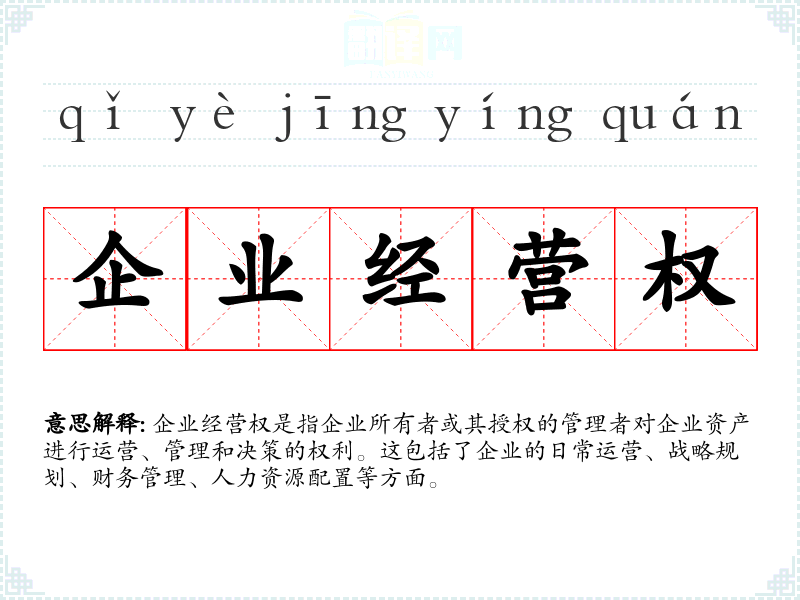企业经营权是指企业所有者或其授权的管理者对企业资产进行运营、管理和决策的权利。这包括了企业的日常运营、战略规划、财务管理、人力资源配置等方面。