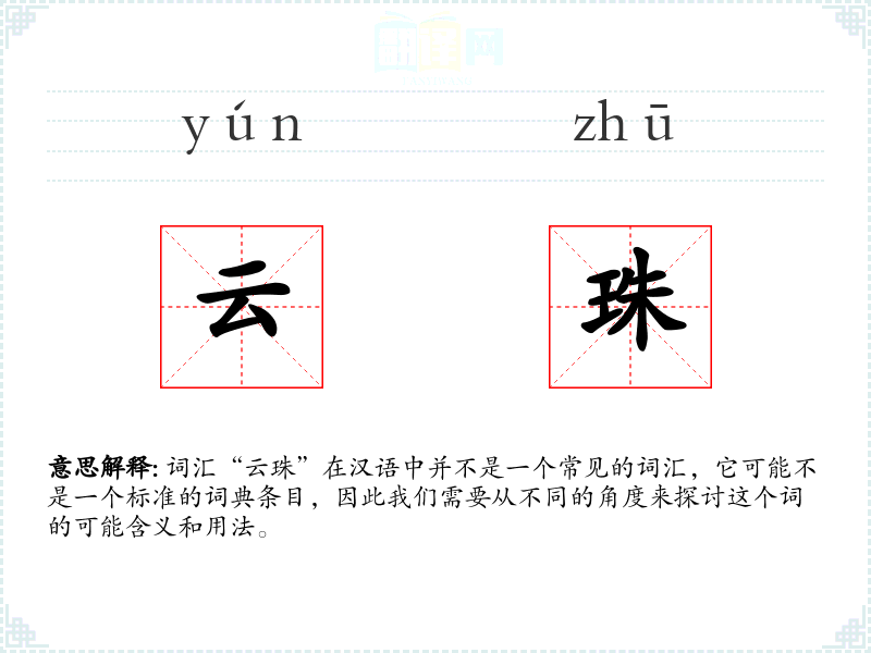 词汇“云珠”在汉语中并不是一个常见的词汇,它可能不是一个标准的词典条目,因此我们需要从不同的角度来探讨这个词的可能含义和用法。