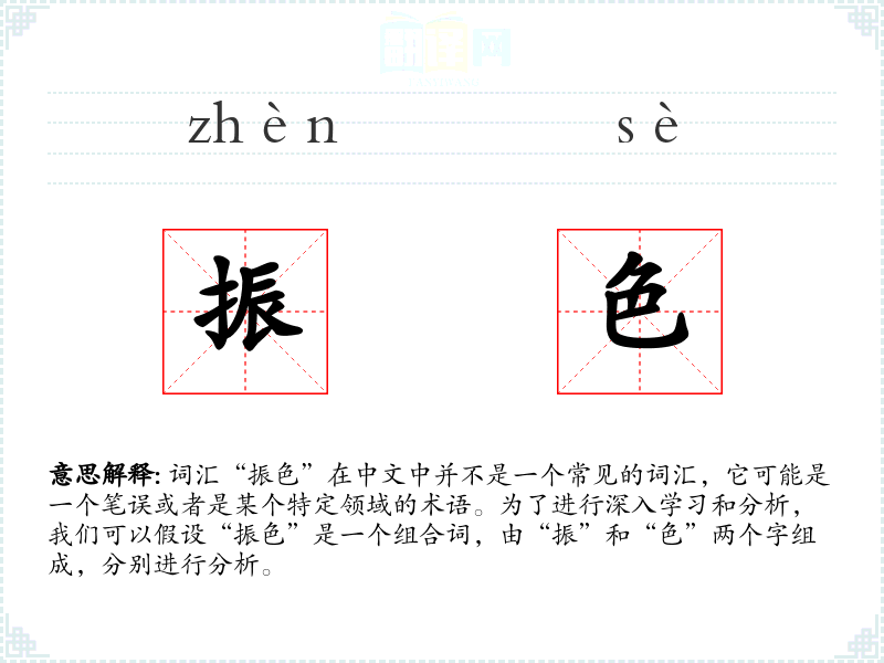 词汇“振色”在中文中并不是一个常见的词汇,它可能是一个笔误或者是某个特定领域的术语。为了进行深入学习和分析,我们可以假设“振色”是一个组合词,由“振”和“色”两个字组成,分别进行分析。
