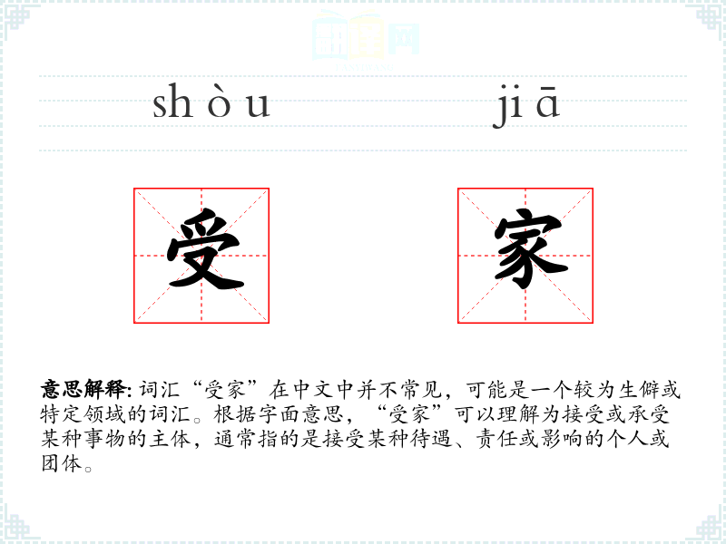 - 理解:“受家”是一个特定且不太常用的词汇,通常用于描述接受或承受某种事物的主体。