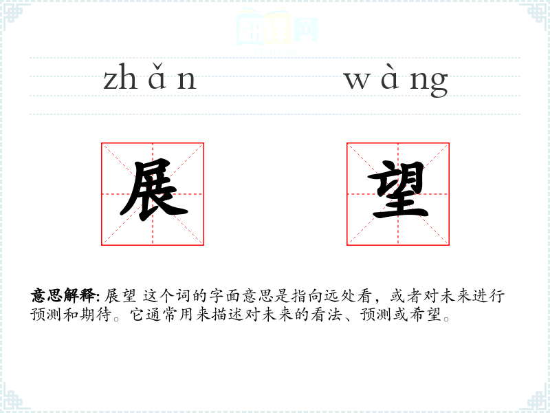 展望 这个词的字面意思是指向远处看,或者对未来进行预测和期待。它通常用来描述对未来的看法、预测或希望。