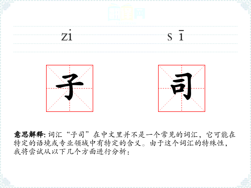 词汇“子司”在中文里并不是一个常见的词汇,它可能在特定的语境或专业领域中有特定的含义。由于这个词汇的特殊性,我将尝试从以下几个方面进行分析: