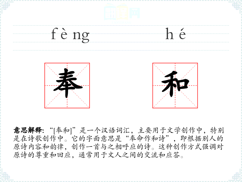 “[奉和]”是一个汉语词汇,主要用于文学创作中,特别是在诗歌创作中。它的字面意思是“奉命作和诗”,即根据别人的原诗内容和韵律,创作一首与之相呼应的诗。这种创作方式强调对原诗的尊重和回应,通常用于文人之间的交流和应答。