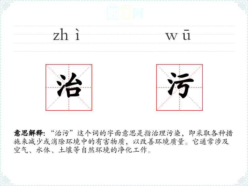 “治污”这个词的字面意思是指治理污染,即采取各种措施来减少或消除环境中的有害物质,以改善环境质量。它通常涉及空气、水体、土壤等自然环境的净化工作。