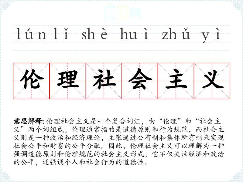 伦理社会主义是一个复合词汇,由“伦理”和“社会主义”两个词组成。伦理通常指的是道德原则和行为规范,而社会主义则是一种政治和经济理论,主张通过公有制和集体所有制来实现社会公平和财富的公平分配。因此,伦理社会主义可以理解为一种强调道德原则和伦理规范的社会主义形式,它不仅关注经济和政治的公平,还强调个人和社会行为的道德性。