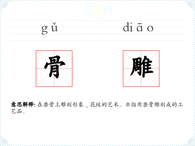 在兽骨上雕刻形象﹑花纹的艺术。亦指用兽骨雕刻成的工艺品。