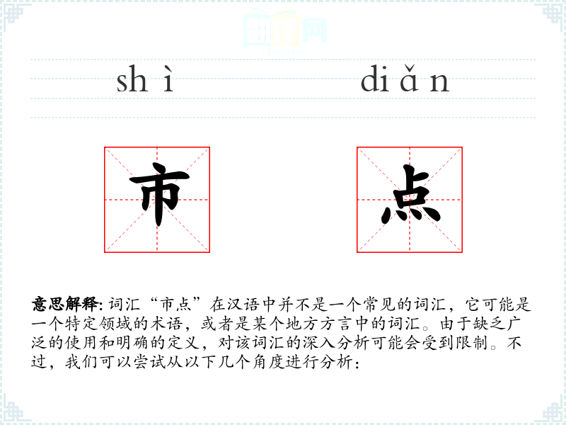 由于“市点”不是一个标准词汇,我们无法给出确切的字面意思和基本含义。它可能是指市场上的某个特定位置,或者是与市场相关的某种概念。
