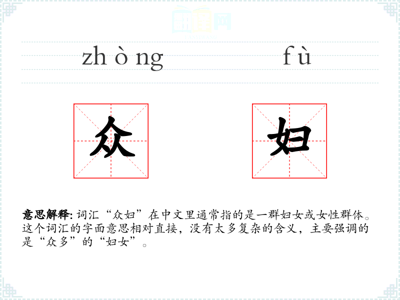 - 词源:“众”字古已有之,意为众多;“妇”字指妇女。