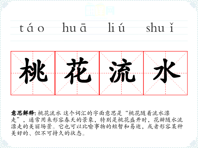 桃花流水 这个词汇的字面意思是“桃花随着流水漂走”,通常用来形容春天的景象,特别是桃花盛开时,花瓣随水流漂走的美丽场景。它也可以比喻事物的短暂和易逝,或者形容某种美好的、但不可持久的状态。