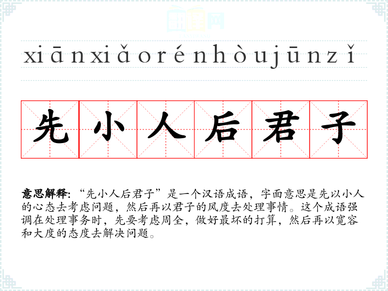 “先小人后君子”是一个汉语成语,字面意思是先以小人的心态去考虑问题,然后再以君子的风度去处理事情。这个成语强调在处理事务时,先要考虑周全,做好最坏的打算,然后再以宽容和大度的态度去解决问题。