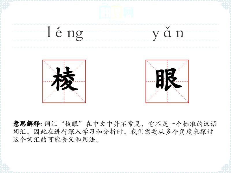 “棱眼”字面意思可能指的是具有棱角形状的眼睛,或者是指眼神锐利、有棱有角的样子。这个词汇可能是由“棱”(指物体的边角)和“眼”(指眼睛)两个字组合而成。