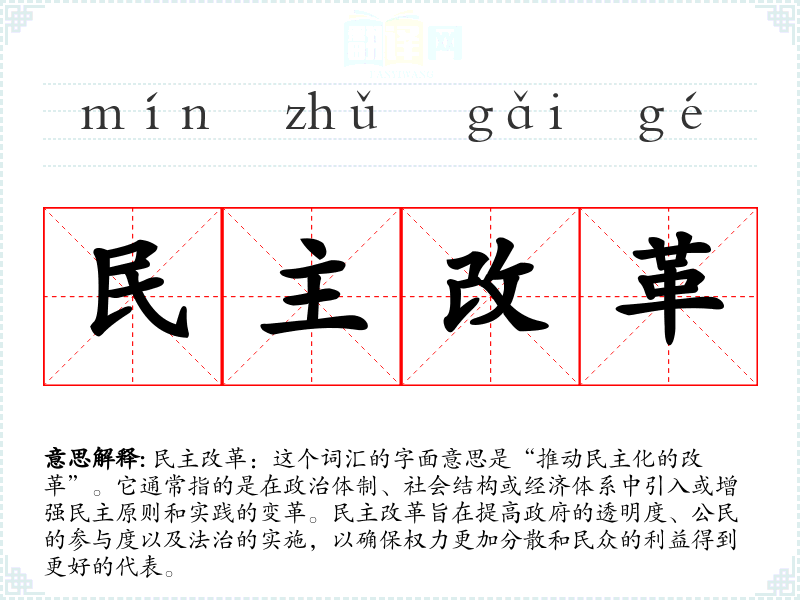 民主改革:这个词汇的字面意思是“推动民主化的改革”。它通常指的是在政治体制、社会结构或经济体系中引入或增强民主原则和实践的变革。民主改革旨在提高政府的透明度、公民的参与度以及法治的实施,以确保权力更加分散和民众的利益得到更好的代表。