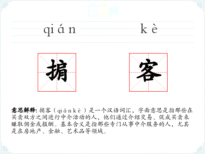 掮客(qián kè)是一个汉语词汇,字面意思是指那些在买卖双方之间进行中介活动的人,他们通过介绍交易、促成买卖来赚取佣金或报酬。基本含义是指那些专门从事中介服务的人,尤其是在房地产、金融、艺术品等领域。