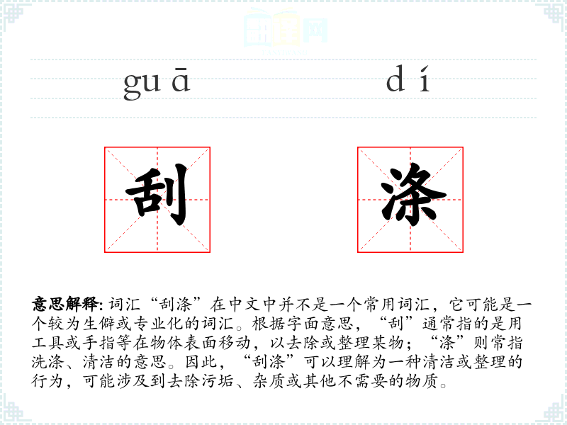 词汇“刮涤”在中文中并不是一个常用词汇,它可能是一个较为生僻或专业化的词汇。根据字面意思,“刮”通常指的是用工具或手指等在物体表面移动,以去除或整理某物;“涤”则常指洗涤、清洁的意思。因此,“刮涤”可以理解为一种清洁或整理的行为,可能涉及到去除污垢、杂质或其他不需要的物质。