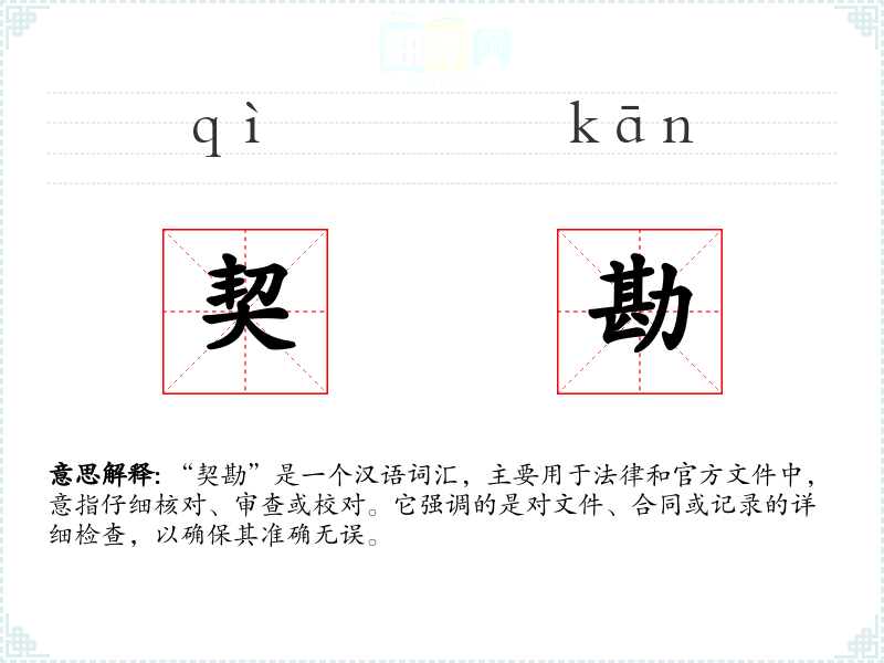 在英语中,类似的词汇可能是“review”或“verify”,但它们在语境和用法上与“契勘”有所不同。英语中的这些词汇更通用,而“契勘”则更侧重于法律和官方文件的核对。