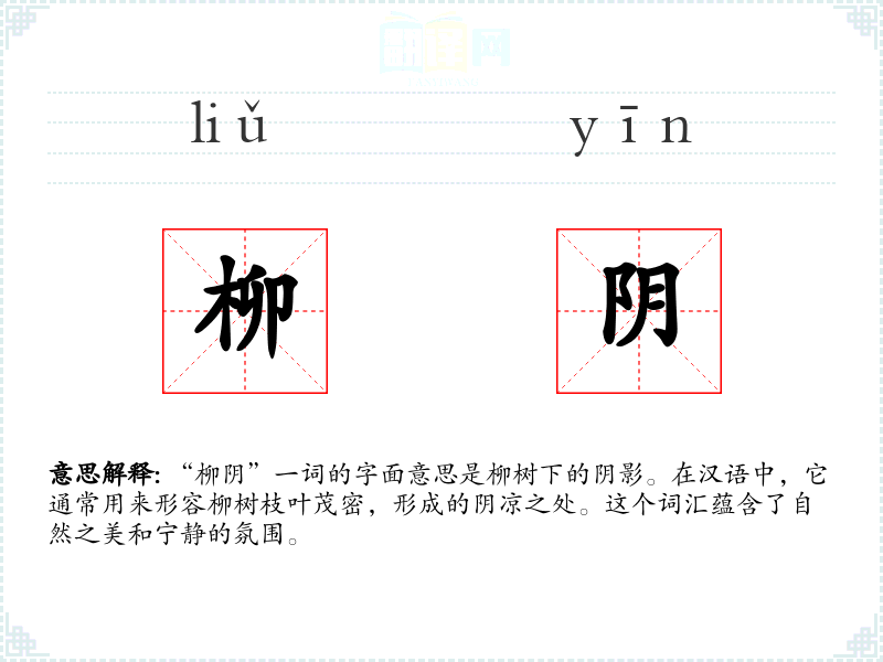 “柳阴”一词的字面意思是柳树下的阴影。在汉语中,它通常用来形容柳树枝叶茂密,形成的阴凉之处。这个词汇蕴含了自然之美和宁静的氛围。