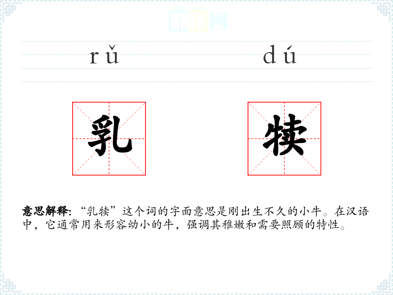 “乳犊”这个词的字面意思是刚出生不久的小牛。在汉语中,它通常用来形容幼小的牛,强调其稚嫩和需要照顾的特性。