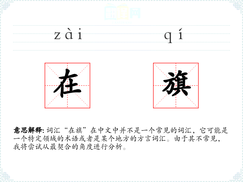 词汇“在旗”在中文中并不是一个常见的词汇,它可能是一个特定领域的术语或者是某个地方的方言词汇。由于其不常见,我将尝试从最契合的角度进行分析。