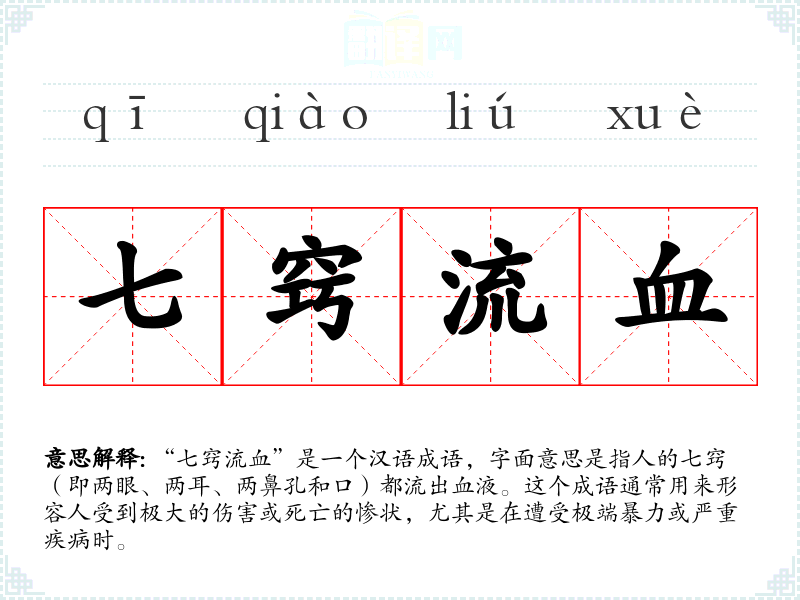 “七窍流血”是一个汉语成语,字面意思是指人的七窍(即两眼、两耳、两鼻孔和口)都流出血液。这个成语通常用来形容人受到极大的伤害或死亡的惨状,尤其是在遭受极端暴力或严重疾病时。