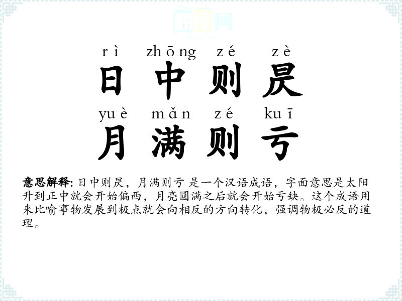 - rì zhōng zé zè,yuè mǎn zé kuī日中则昃,月满则亏