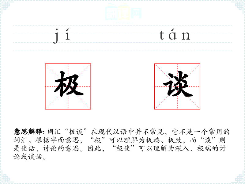 词汇“极谈”在现代汉语中并不常见,它不是一个常用的词汇。根据字面意思,“极”可以理解为极端、极致,而“谈”则是谈话、讨论的意思。因此,“极谈”可以理解为深入、极端的讨论或谈话。