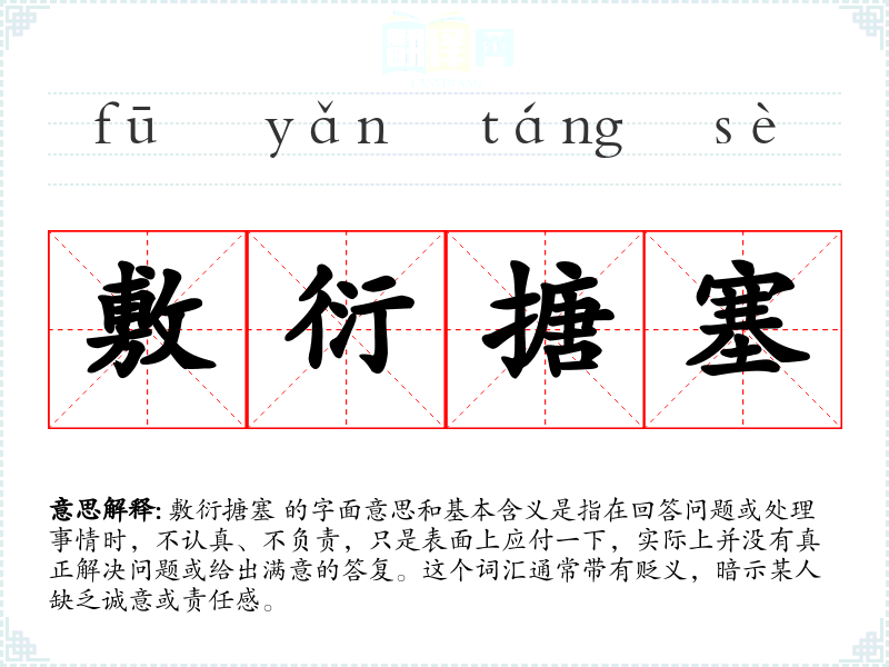 敷衍搪塞 的字面意思和基本含义是指在回答问题或处理事情时,不认真、不负责,只是表面上应付一下,实际上并没有真正解决问题或给出满意的答复。这个词汇通常带有贬义,暗示某人缺乏诚意或责任感。