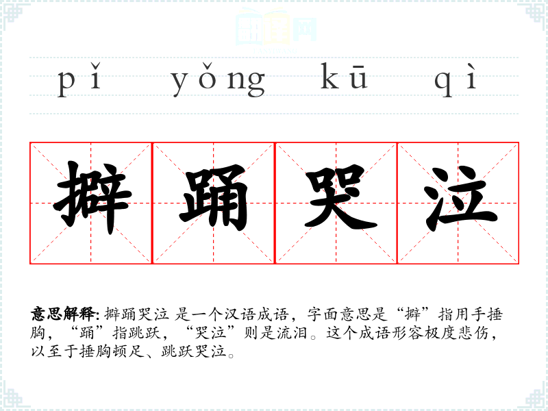擗踊哭泣 是一个汉语成语,字面意思是“擗”指用手捶胸,“踊”指跳跃,“哭泣”则是流泪。这个成语形容极度悲伤,以至于捶胸顿足、跳跃哭泣。