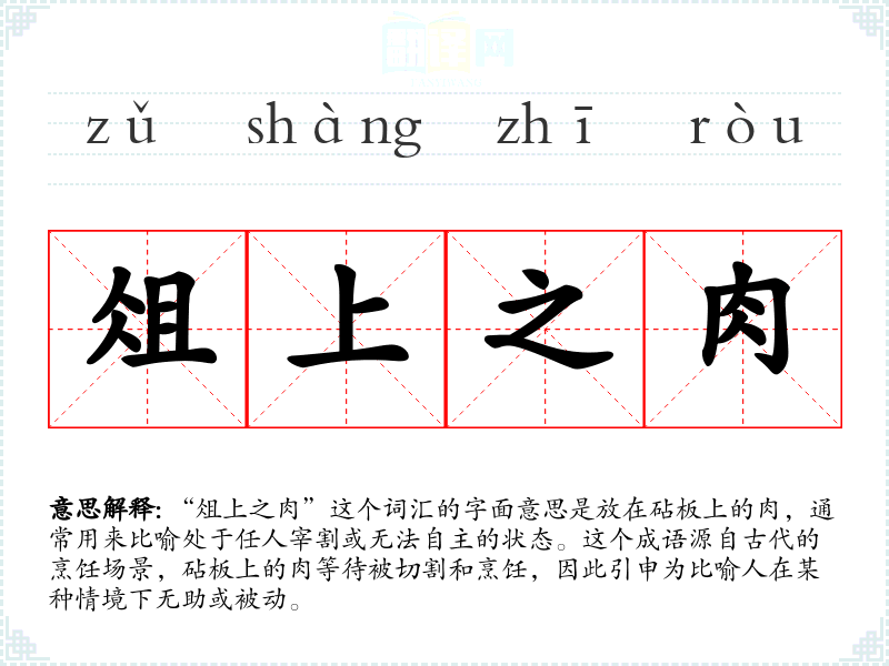 “俎上之肉”这个词汇的字面意思是放在砧板上的肉,通常用来比喻处于任人宰割或无法自主的状态。这个成语源自古代的烹饪场景,砧板上的肉等待被切割和烹饪,因此引申为比喻人在某种情境下无助或被动。