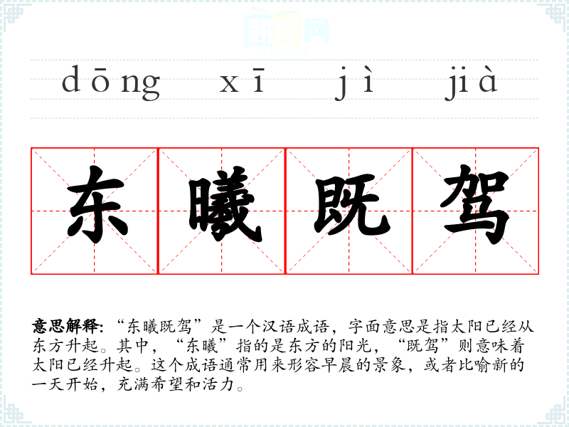 “东曦既驾”这个成语的词源较为古老,源自**古代对日出的描绘。在古代文学作品中,日出常常被赋予象征意义,如新的开始、希望和活力。随着时间的推移,这个成语在文学和日常语言中被广泛使用,但其基本含义和象征意义保持不变。