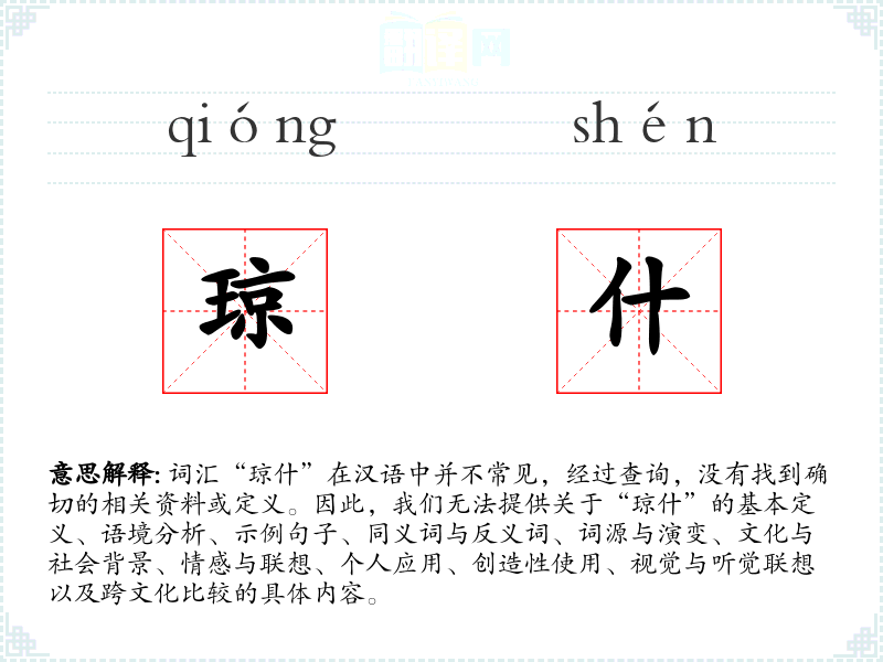 词汇“琼什”在汉语中并不常见,经过查询,没有找到确切的相关资料或定义。因此,我们无法提供关于“琼什”的基本定义、语境分析、示例句子、同义词与反义词、词源与演变、文化与社会背景、情感与联想、个人应用、创造性使用、视觉与听觉联想以及跨文化比较的具体内容。