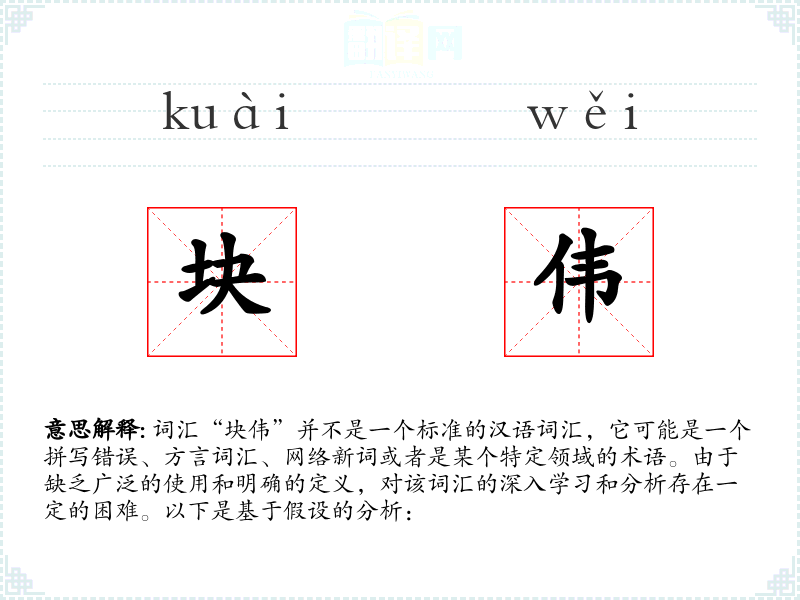 由于“块伟”不是一个标准词汇,我们无法给出确切的基本定义。如果将其拆分为“块”和“伟”两个字,可以理解为“巨大的块状物体”或“非常伟大”的意思,但这只是字面上的猜测。
