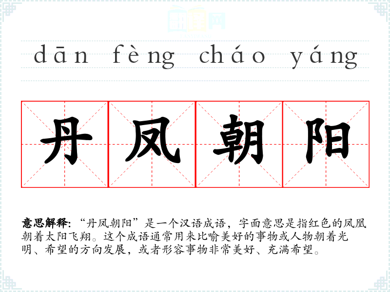 “丹凤朝阳”是一个汉语成语,字面意思是指红色的凤凰朝着太阳飞翔。这个成语通常用来比喻美好的事物或人物朝着光明、希望的方向发展,或者形容事物非常美好、充满希望。