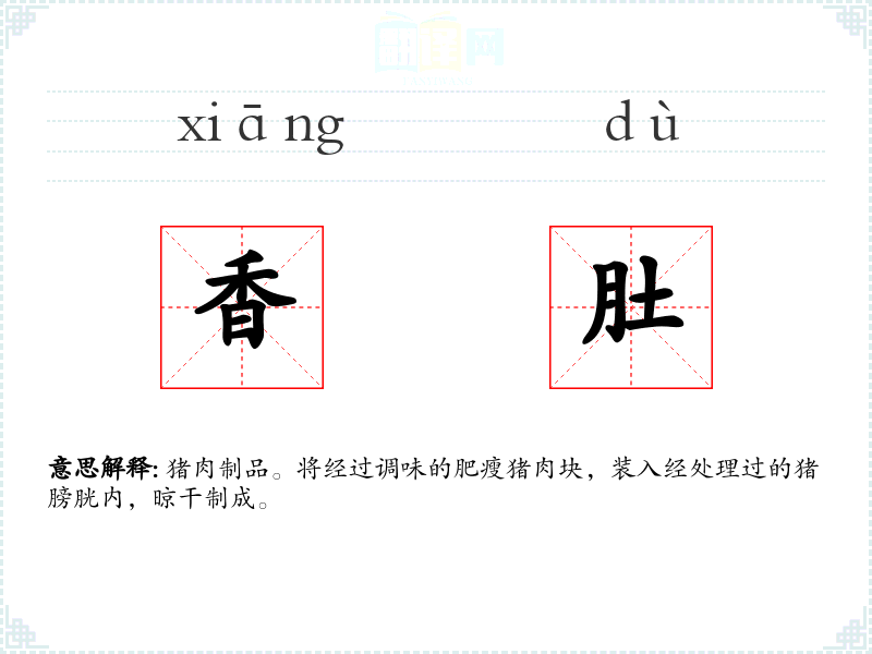 猪肉制品。将经过调味的肥瘦猪肉块,装入经处理过的猪膀胱内,晾干制成。