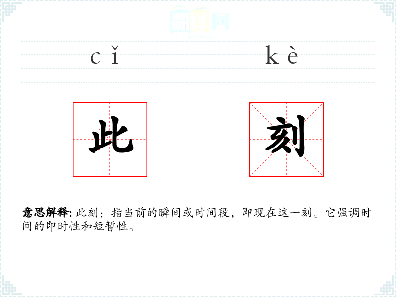 此刻:指当前的瞬间或时间段,即现在这一刻。它强调时间的即时性和短暂性。