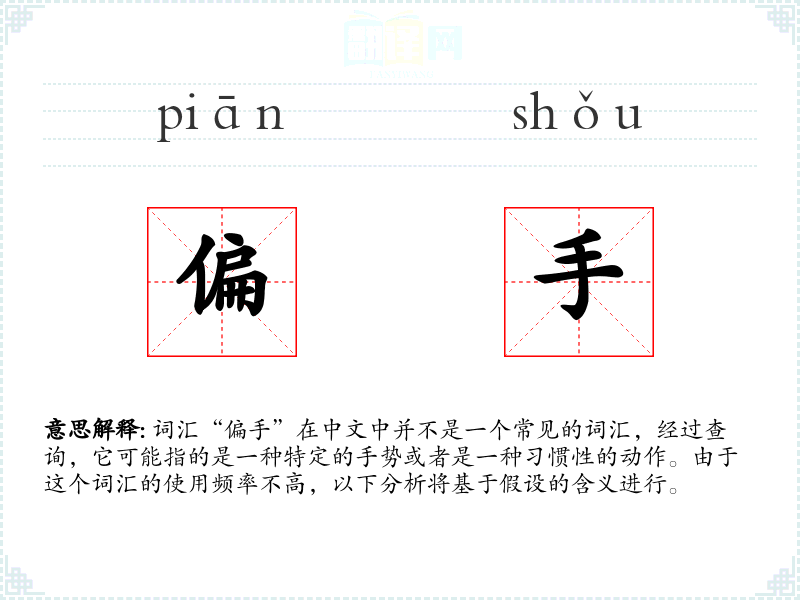 词汇“偏手”在中文中并不是一个常见的词汇,经过查询,它可能指的是一种特定的手势或者是一种习惯性的动作。由于这个词汇的使用频率不高,以下分析将基于假设的含义进行。