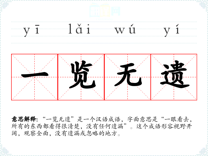 “一览无遗”是一个汉语成语,字面意思是“一眼看去,所有的东西都看得很清楚,没有任何遗漏”。这个成语形容视野开阔,观察全面,没有遗漏或忽略的地方。