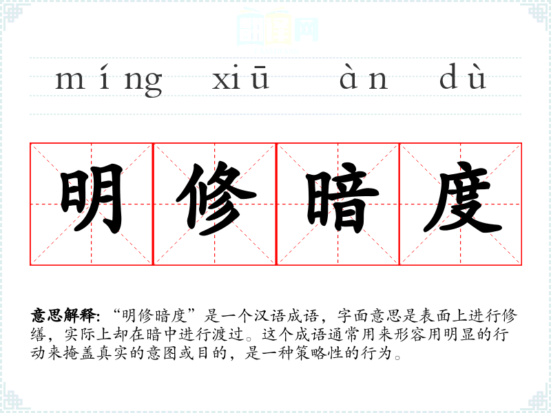 “明修暗度”是一个汉语成语,字面意思是表面上进行修缮,实际上却在暗中进行渡过。这个成语通常用来形容用明显的行动来掩盖真实的意图或目的,是一种策略性的行为。