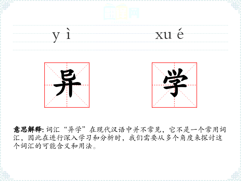 词汇“异学”在现代汉语中并不常见,它不是一个常用词汇,因此在进行深入学*和分析时,我们需要从多个角度来探讨这个词汇的可能含义和用法。