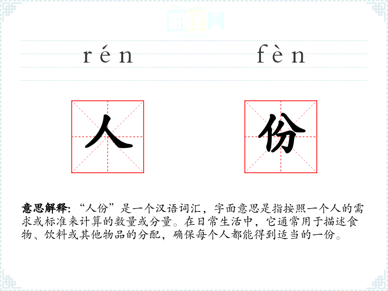 “人份”是一个汉语词汇,字面意思是指按照一个人的需求或标准来计算的数量或分量。在日常生活中,它通常用于描述食物、饮料或其他物品的分配,确保每个人都能得到适当的一份。