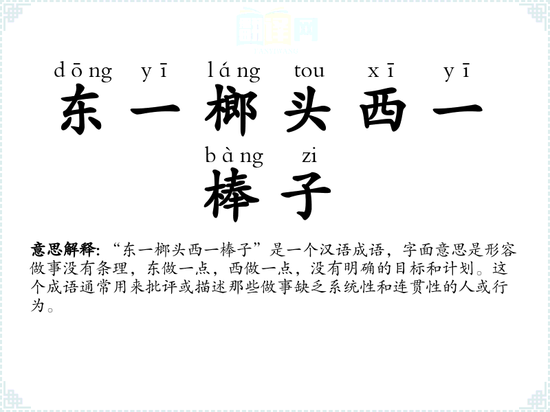 “东一榔头西一棒子”是一个汉语成语,字面意思是形容做事没有条理,东做一点,西做一点,没有明确的目标和计划。这个成语通常用来批评或描述那些做事缺乏系统性和连贯性的人或行为。