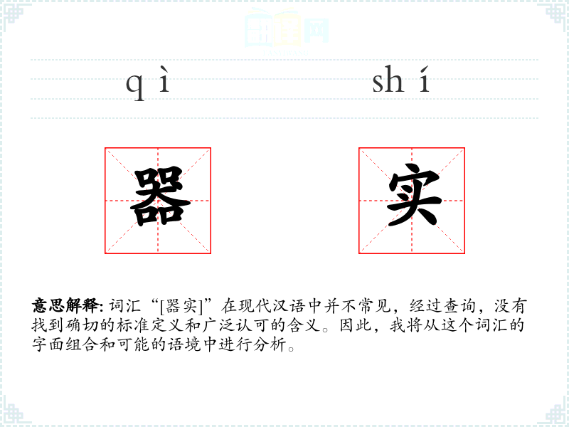 “器实”字面上的组合可能是“器”和“实”两个字的结合。其中,“器”通常指器具、工具或才能,而“实”则指真实、实在或实质。结合起来,“器实”可能指的是器具的实用性或人的才能的真实性。