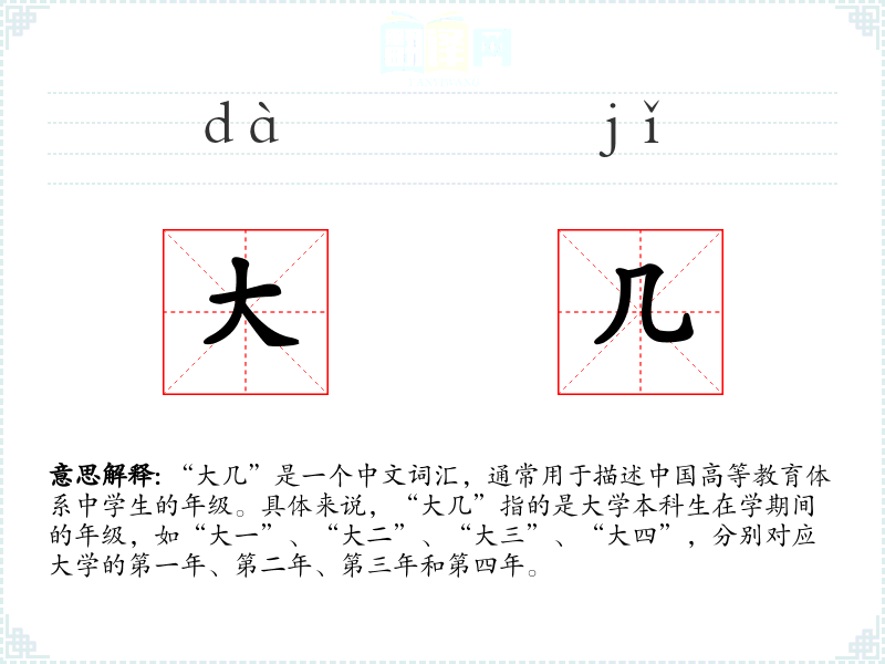 “大几”是一个中文词汇,通常用于描述**高等教育体系中学生的年级。具体来说,“大几”指的是大学本科生在学期间的年级,如“大一”、“大二”、“大三”、“大四”,分别对应大学的第一年、第二年、第三年和第四年。