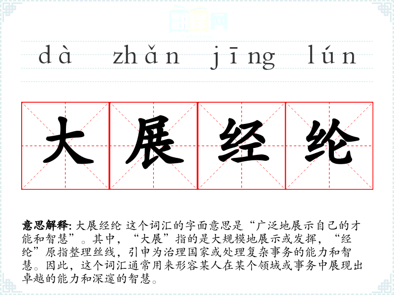 大展经纶 这个词汇不仅是对个人能力的赞扬,也是对智慧和才能的推崇。它在语言学和表达中具有重要性,因为它鼓励人们追求卓越,发挥自己的最大潜力。通过深入学和分析这个词汇,我更加理解了它在不同语境中的应用,以及它在文化和个人发展中的重要性。