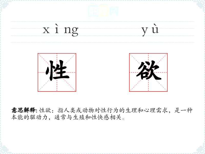 性欲:指人类或动物对性行为的生理和心理需求,是一种本能的驱动力,通常与生殖和性快感相关。
