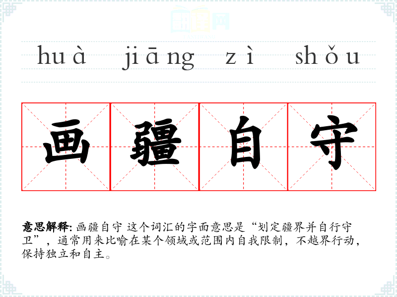 画疆自守 这个词汇的字面意思是“划定疆界并自行守卫”,通常用来比喻在某个领域或范围内自我限制,不越界行动,保持独立和自主。