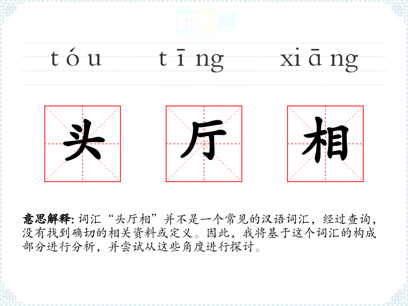 由于“头厅相”不是一个已知的词汇,我们无法对其进行深入的分析和理解。在语言学习和表达中,遇到不明确的词汇时,重要的是通过查询和研究来确定其含义和用法,以确保沟通的准确性和有效性。