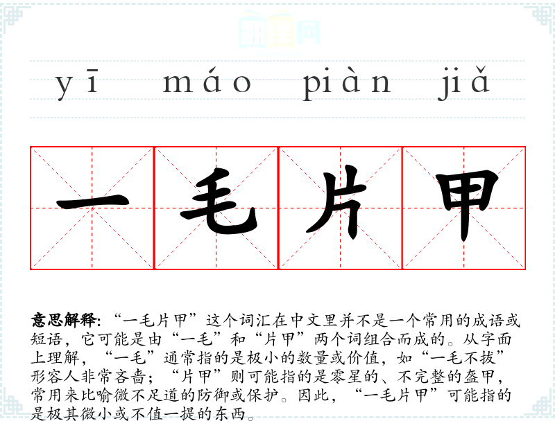 “一毛片甲”这个词汇虽然不是一个常用的成语,但它提供了一种形象的表达方式,用来形容那些微小或不重要的事物。在语言学习和表达中,了解和掌握这样的词汇可以帮助我们更准确地表达自己的想法和感受。