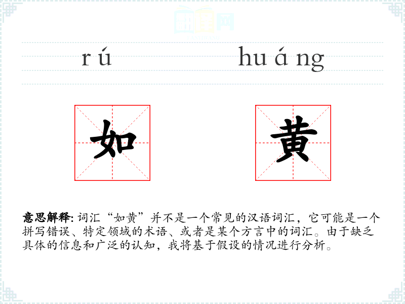 词汇“如黄”并不是一个常见的汉语词汇,它可能是一个拼写错误、特定领域的术语、或者是某个方言中的词汇。由于缺乏具体的信息和广泛的认知,我将基于假设的情况进行分析。