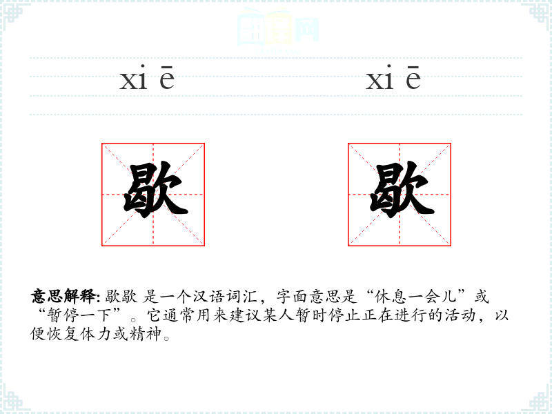 歇歇 是一个汉语词汇,字面意思是“休息一会儿”或“暂停一下”。它通常用来建议某人暂时停止正在进行的活动,以便恢复体力或精神。