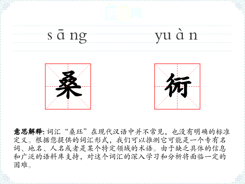 词汇“桑珏”在现代汉语中并不常见,也没有明确的标准定义。根据您提供的词汇形式,我们可以推测它可能是一个专有名词、地名、人名或者是某个特定领域的术语。由于缺乏具体的信息和广泛的语料库支持,对这个词汇的深入学习和分析将面临一定的困难。